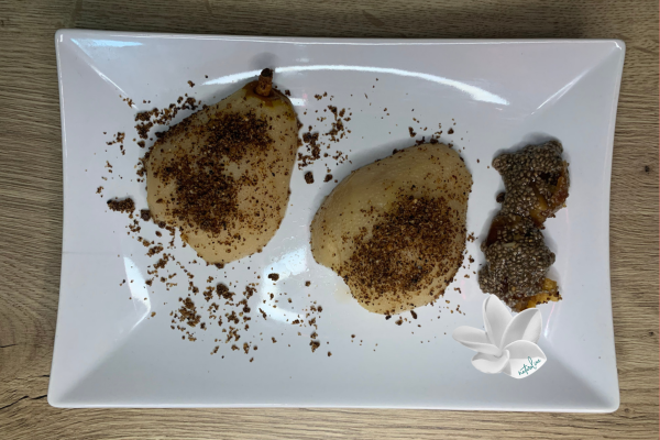 Dans 4 ramequins, diviser les morceaux de poires caramélisées et les noix de pécan. Verser par-dessus la boisson végétale encore chaude en prenant soin d’enlever la gousse de vanille. Mélanger. Attendre quelques instants et parsemer de pépites de chocolat. Mettre au frais durant 2 heures et déguster.